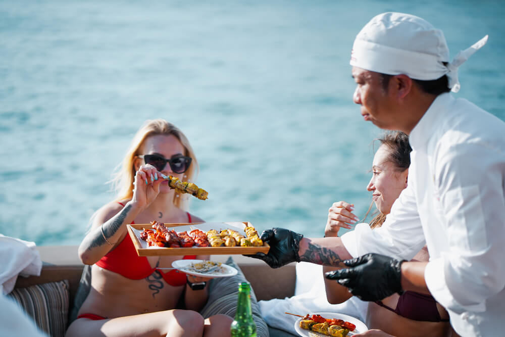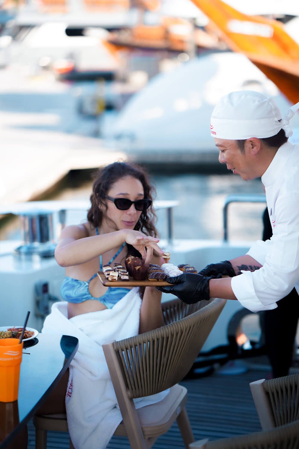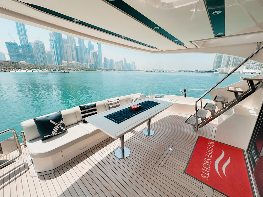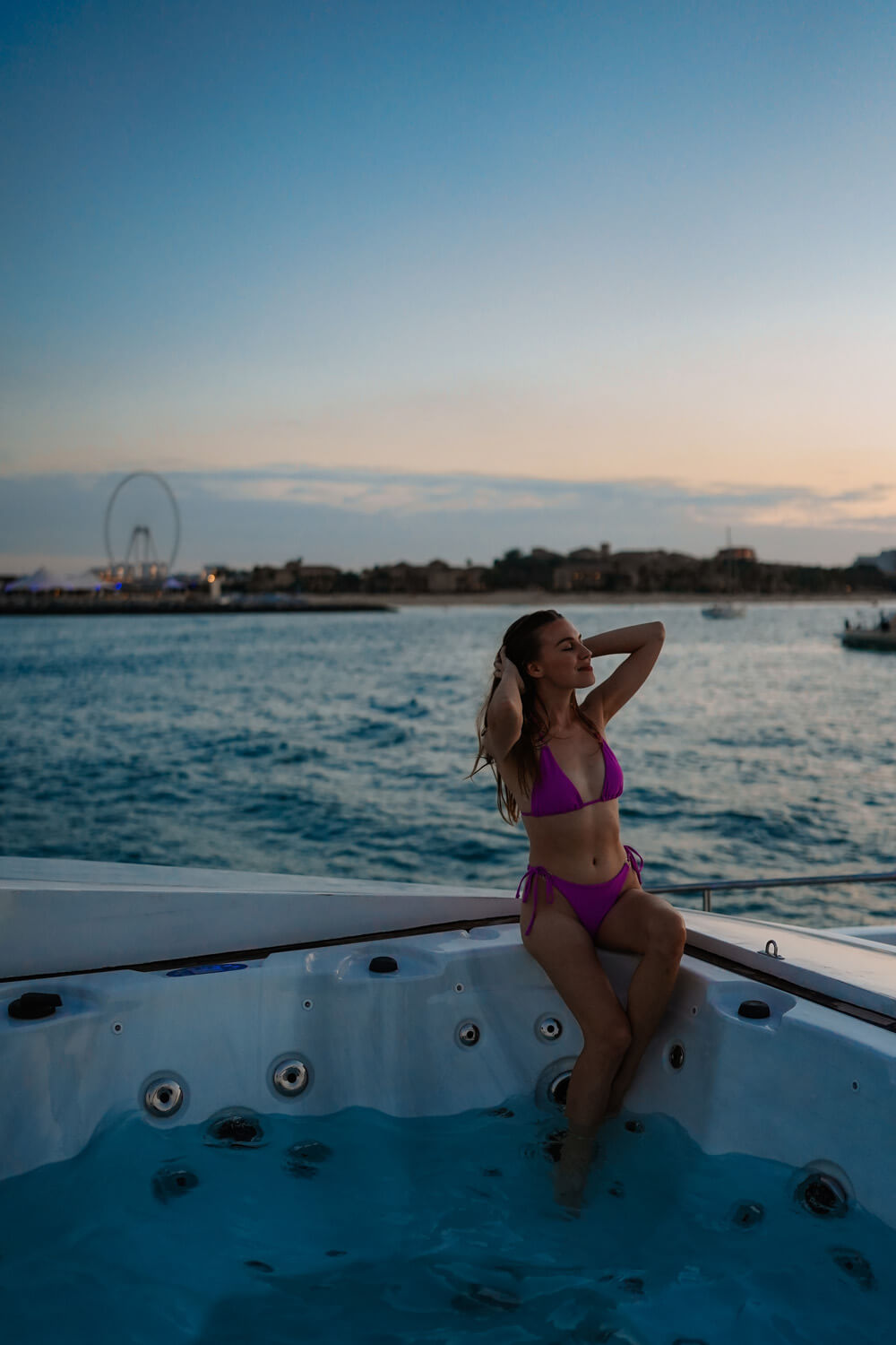 Notre voyage a commencé avec une douce croisière vers JBR, où la fonction de fête unique du yacht est entrée en jeu – l’ouverture d’une piscine au niveau de la mer à Stern. Cet élément de conception innovant transforme la plate-forme de natation en une aire de jeux aquatique, permettant aux clients de profiter simultanément de luxe du yacht et de l’océan direct.