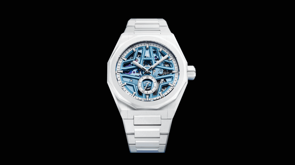 Complétant la célèbre trilogie Surfer avec Time+Tide, Zenith présente sa montre inspirée de l’océan la plus visuellement frappante. Le boîtier en céramique blanche de 41 mm allie une construction légère à une résistance exceptionnelle aux rayures, tandis que le cadran squeletté présente un dégradé vertical passant du bleu plus foncé au bleu clair, évoquant la descente des profondeurs océaniques jusqu’à la luminosité de la surface.