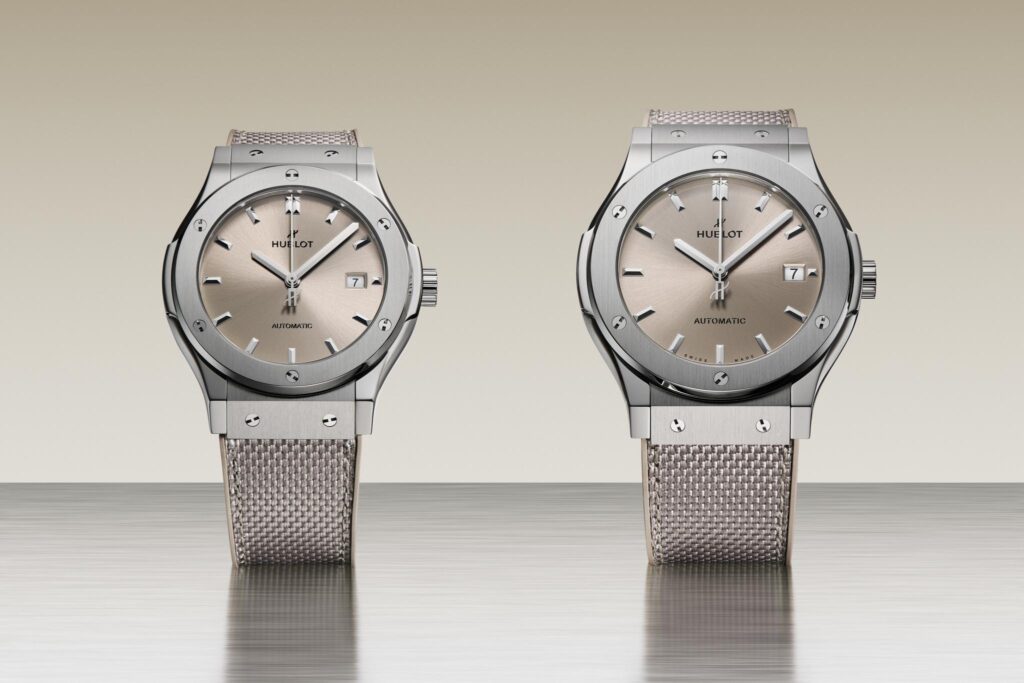 La Classic Fusion Essential Taupe de Hublot marque le volume IV de la série monochrome de la marque. Disponible en 42 mm et 45 mm, elle associe un cadran taupe soleil à des boîtiers en titane poli et satiné et des bracelets en caoutchouc et tissu assortis. Animée par un mouvement à remontage automatique doté de 48 heures de réserve, elle allie l’élégance discrète à la précision technique de Hublot. Le taupe confère à la montre une présence discrète mais indéniable, poursuivant la tradition de la marque en matière d’éditions Essential limitées et hautement collectionnables.