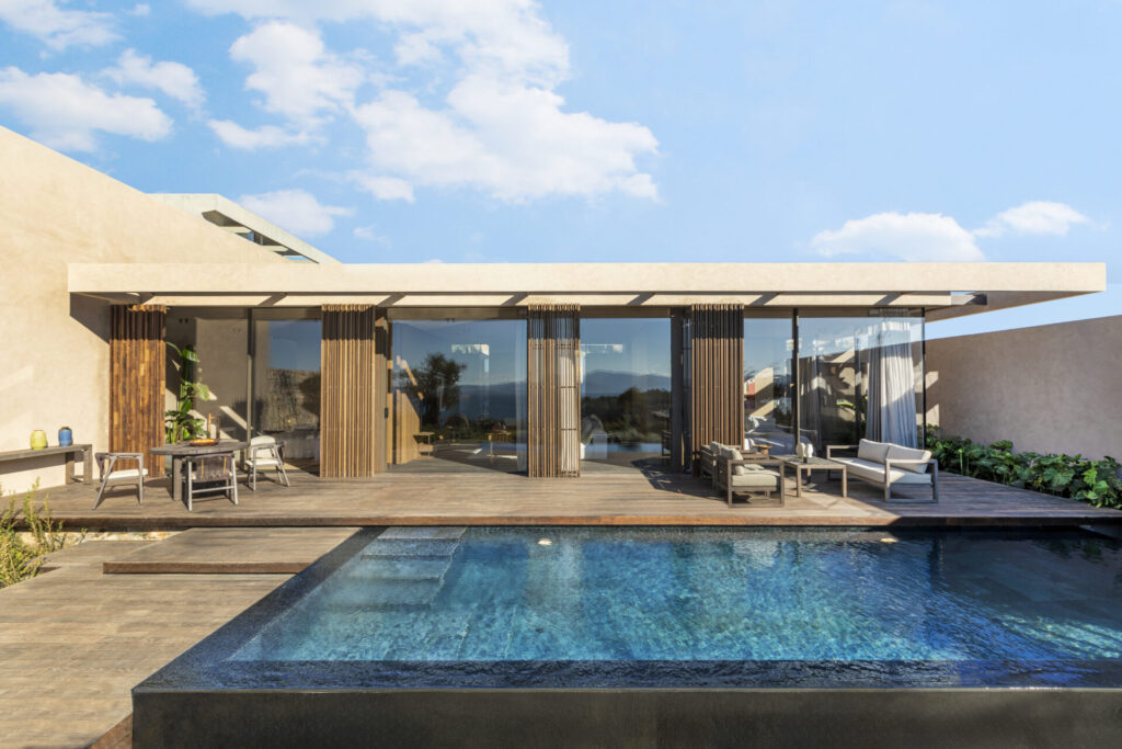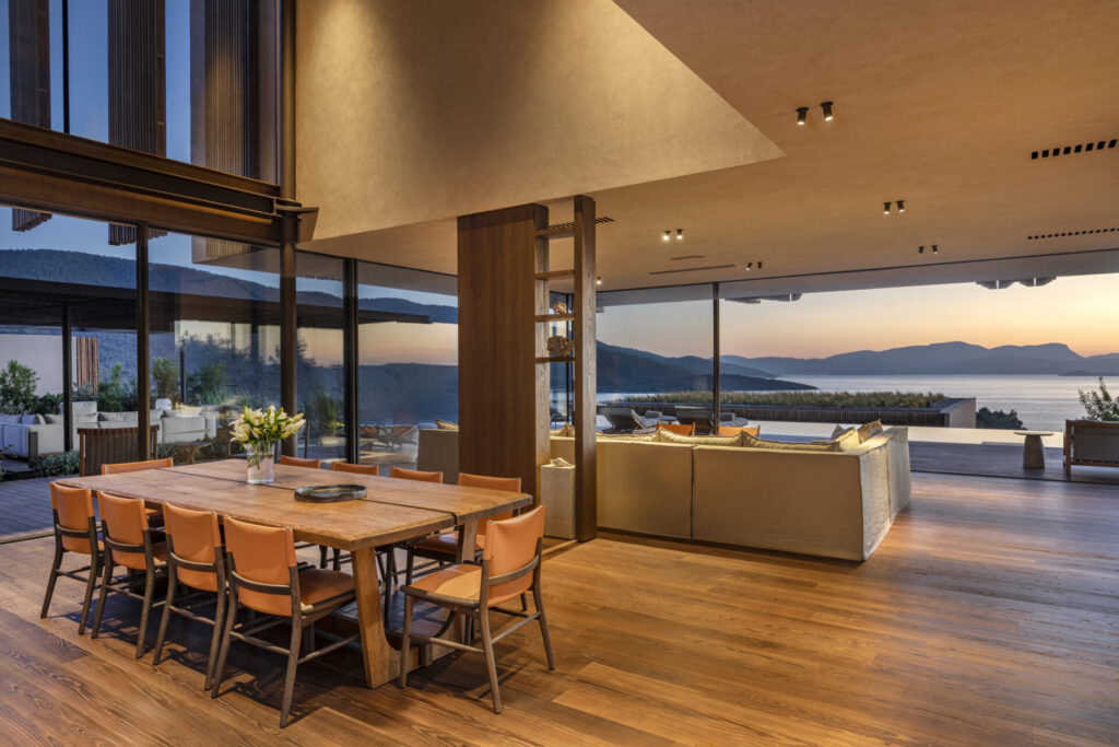 Chaque villa offre une vue imprenable sur la mer Égée, des piscines privées chauffées et des espaces de vie intérieur-extérieur homogènes où les doux sons de la mer font partie de l’ambiance du repas. Les intérieurs combinent matériaux naturels, textures chaleureuses et finitions élégantes, offrant une sensation de calme et d’intimité qui encourage à la fois la détente et la réflexion.