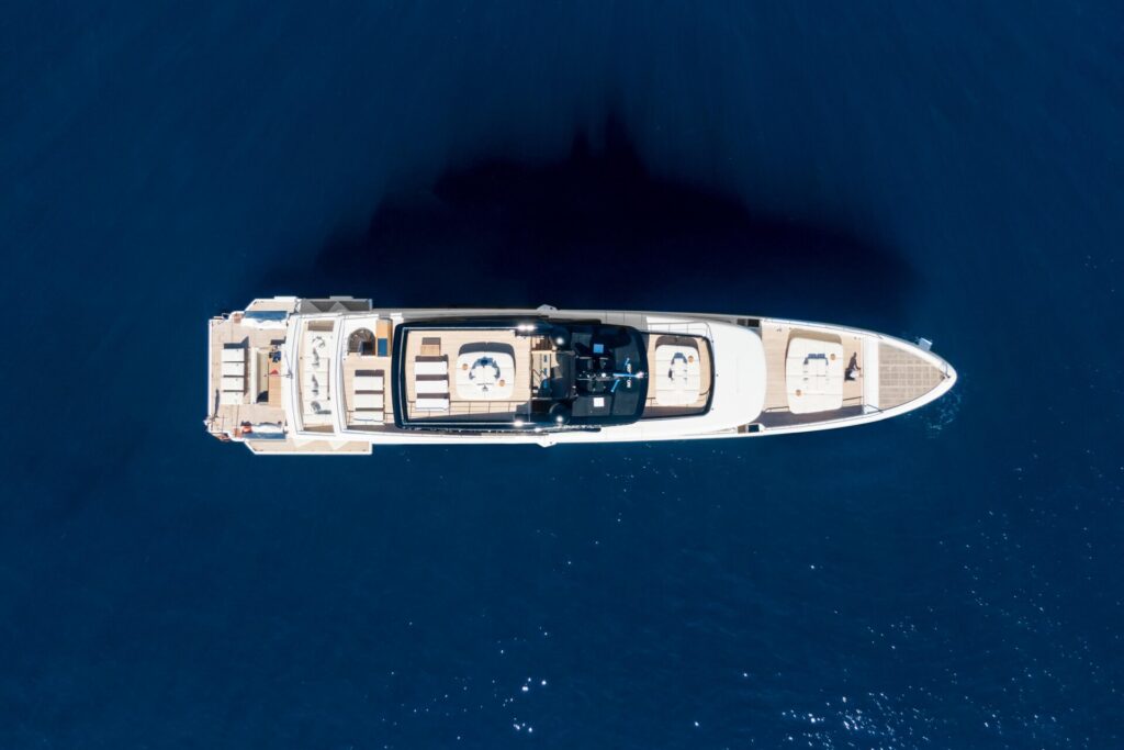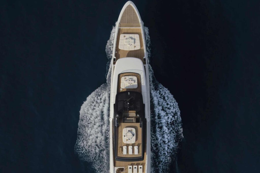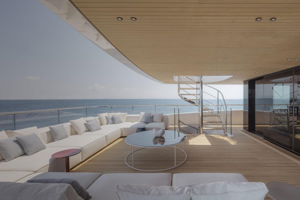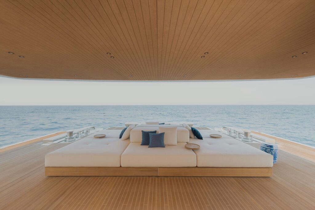Le club de plage et le salon océan s’étendent sur toute la largeur du yacht au niveau de la mer, s’ouvrant directement sur l’eau. Il s’agit d’un grand espace ensoleillé avec un accès facile à la plateforme de bain et une aisance naturelle qui donne envie aux clients de rester. Qu’il s’agisse d’une baignade matinale, d’un après-midi sur les SEABOB ou d’un apéritif pendant que l’ancre tient, c’est là que tout se passe.