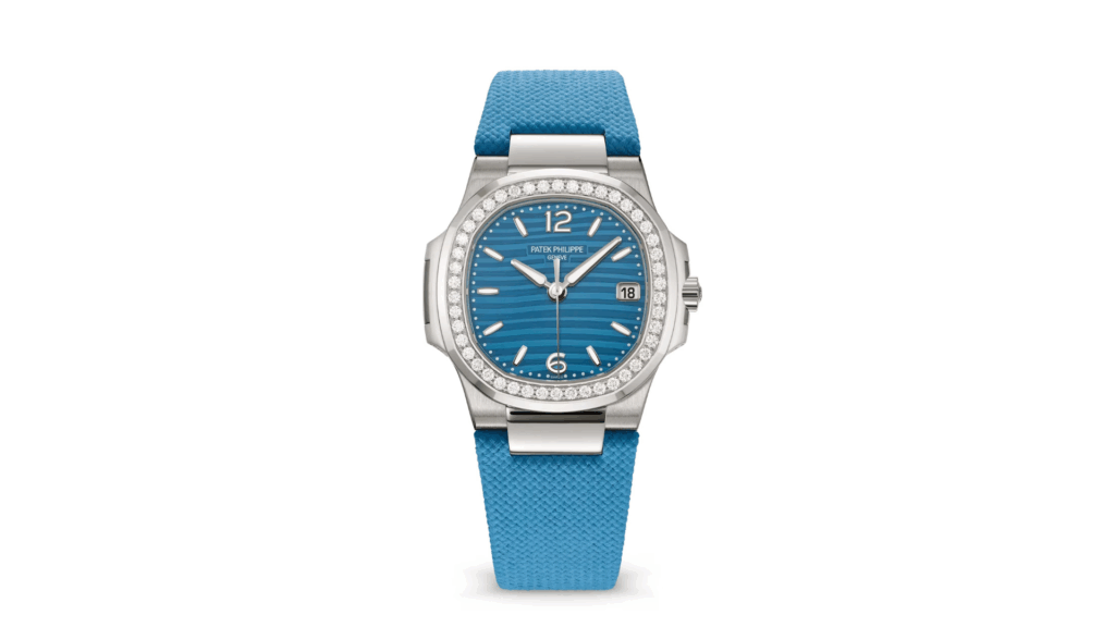 Patek Philippe explore la couleur dans sa Nautilus pour femme de petite taille, dotée d’un cadran laqué bleu azur. La teinte est portée par le bracelet composite ultra-robuste avec un motif en tissu, fixé par une boucle déployante Nautilus en or blanc. La lunette octogonale est sertie de 46 diamants taille brillant, tandis que le motif « vague » laqué, les chiffres et index appliqués en or blanc avec revêtement luminescent et les aiguilles de style alpha en or blanc complètent un design à la fois raffiné et expressif.