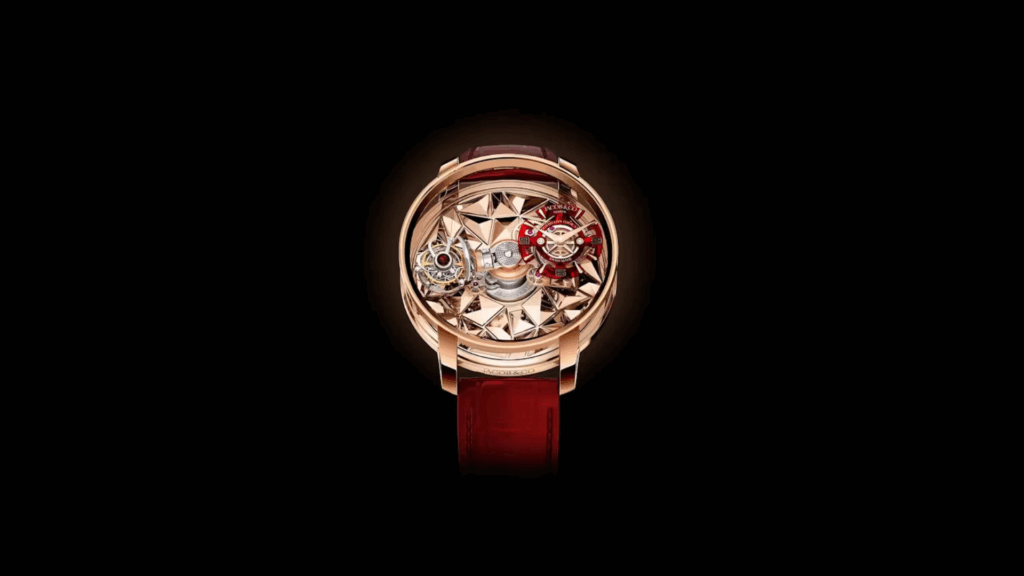 L’Astronomia Four-Axis Tourbillon de Jacob & Co. témoigne de l’art mécanique. La montre est dotée d’un tourbillon à quatre axes, chaque axe tournant à intervalles distincts, mettant en valeur une interaction dynamique de mouvement. Logé dans un boîtier en or rose de 47 mm, le mouvement squeletté est visible à travers des fenêtres en saphir, permettant à la lumière de danser sur les composants aux finitions complexes. Ce garde-temps indique non seulement l’heure, mais agit comme une sculpture cinétique sur le poignet.