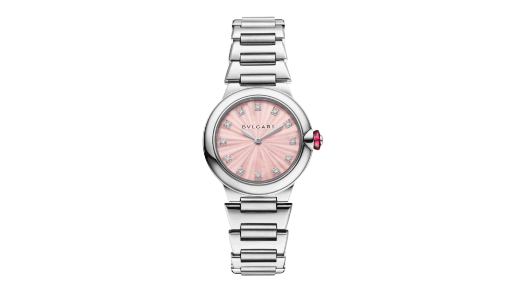 Symbole de la féminité moderne, la nacre rose Bulgari Lvcea allie élégance et portabilité au quotidien. Le boîtier en acier inoxydable poli et satiné encadre un cadran en marqueterie de nacre rose, serti de 12 index diamants.