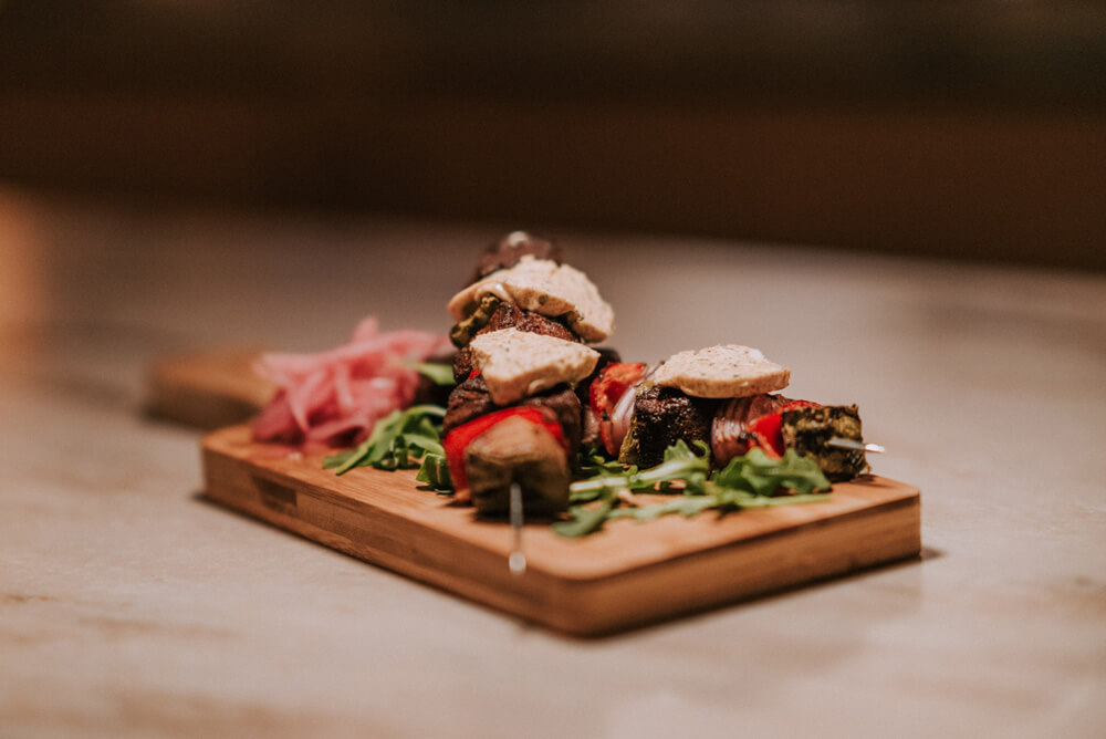 Ces brochettes aux crevettes herbes-gerliques démontrent la touche légère de la cuisine avec les fruits de mer. Les crevettes maintiennent une tendresse parfaite tout en prenant des notes de subtiles à l’ail, complétées par un beurre de citron-ail qui améliore plutôt que de masquer leur douceur naturelle. La roquette sauvage et les agrumes locaux offrent des contrepoints frais, tandis que l’huile d’olive de haute qualité ajoute de la richesse et de la sensation en bouche à ce démarreur.