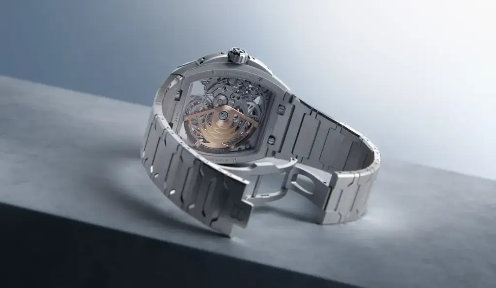 La construction en titane fournit le rapport résistance / poids nécessaire tout en maintenant l’esthétique premium attendue de Haute Horlogerie. Le choix du matériel reflète un examen attentif à la fois des exigences techniques et de l’attrait visuel, garantissant que le mouvement fonctionne aussi magnifiquement qu’il y paraît.